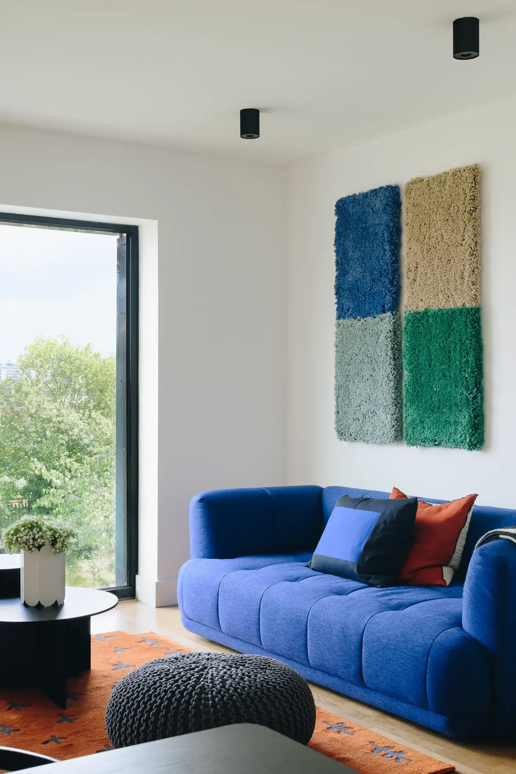 To source the larger furnishings, we were delighted to work with our friends at Minima, a Jewellery Quarter-based furniture and lighting showroom who provided the 'work-from-home' wall configuration in living space, as well as the beautiful quilted sofa - another nod to a canalside craft. We opted for a lot of black steel finishing in the storage units and bed frames to create a strong impact against the light and airy walls, but incorporated natural materials, woven textures and our own hand tufted wall tapestries to add softness and comfort.